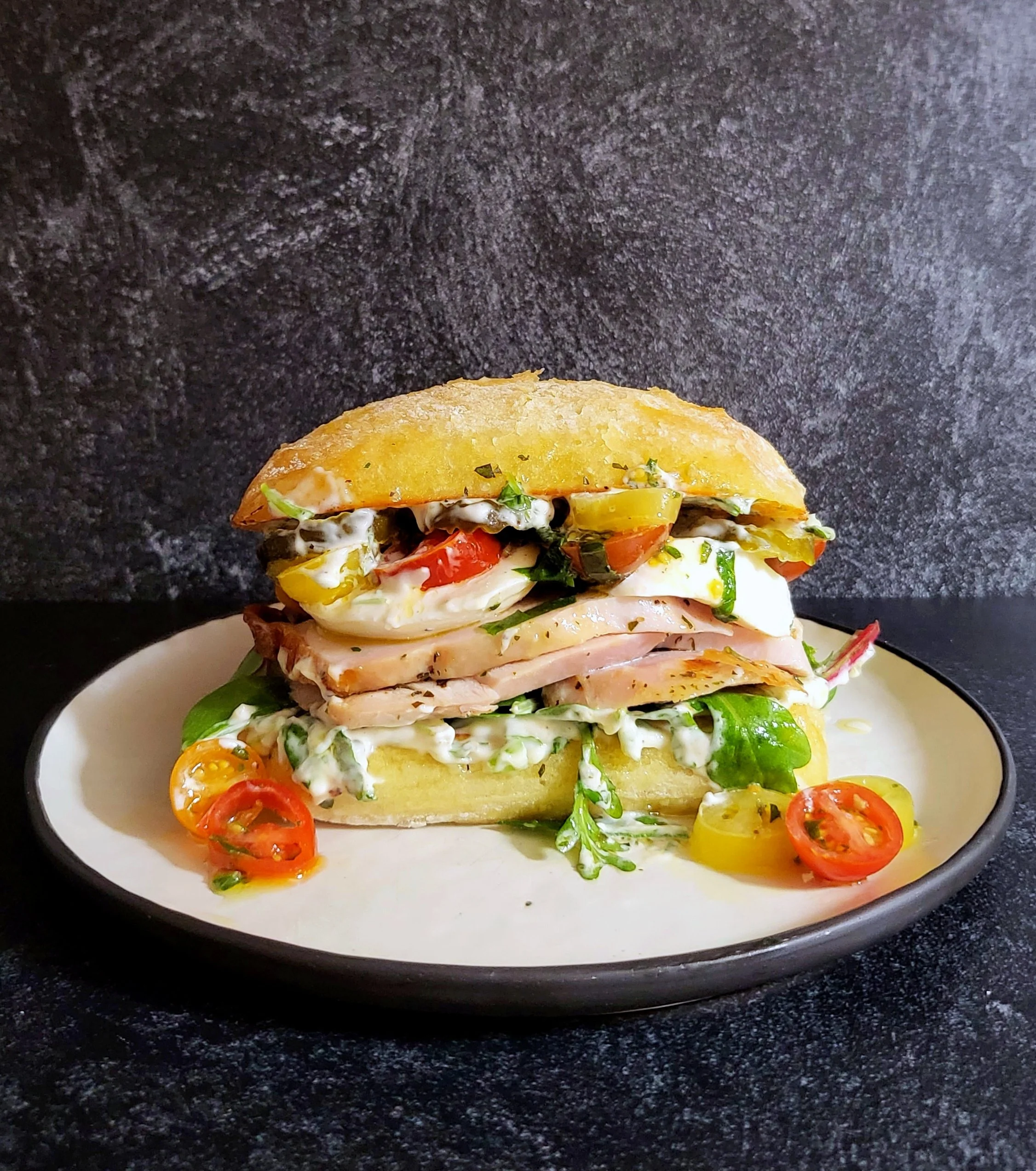 Spread some herb butter on the ciabatta bread and toast on the pan until golden brown. Build the sandwich with herb mayo, mixed greens, turkey slices, mozzarella, marinated tomatoes, and bread & butter pickles.